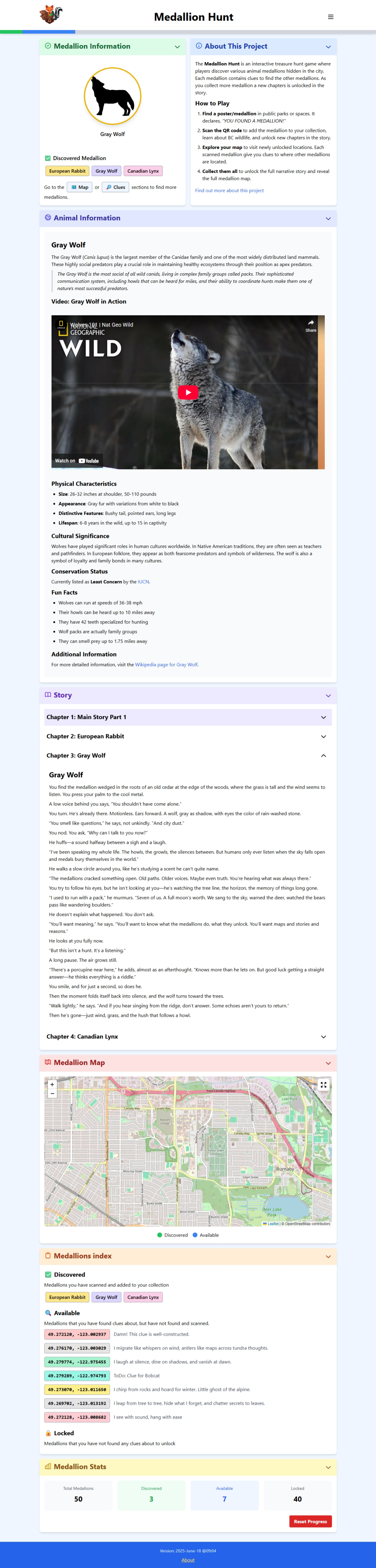 Between June 15th and August 15th, 2025, I built and ran a project called The Medallion Hunt — an interactive, city-wide treasure hunt where players could find animal-themed medallions hidden around Burnaby, BC.